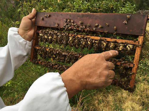 In some of his hives, Lucho grows queens. Queens require special, larger cells, and are fed “royal jelly” by the worker bees. He also has more traditional hives he uses for honey, and Megan got to hold a frame—each box in a hive contains nine wooden, rectangular frames on which bees make honeycomb which they then fill with brood or honey—literally crawling with bees with her bare hands. And we are proud to say she is still sting-free.