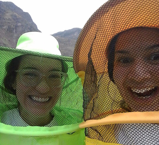Lucho gave us brightly colored veils to protect our faces, but white sweatshirts, as white is a calming color for bees. We stood to the side of the hives—rather than directly in front of them—because bees have a certain path they always take when directly leaving and returning to the hive. The paths are so exact that bees will crash into your leg before righting themselves and going around you: they, like humans, are creatures of habit.